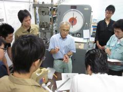 手動ステージの構造分析については、ミニチュアモデルを用いて構造の理解から始めました。現物を見て意見交換することで舞台機構の改善点についてのアイデア出しへと繋げていきます。長期間使用していただく可動ステージ、図面だけの設計にとどまらず現物にて複数の視点から品質向上を図っていきます。次回以降にアイデア出しを行なっていきますが、特に学生さん達は若い感覚により新鮮な意見が出てくるのでとても楽しみです(^^)