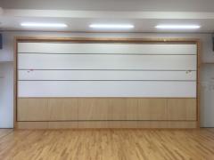 従来の収納舞台は壁とステージの間にすき間が出来て物が落ちる原因になっていました。