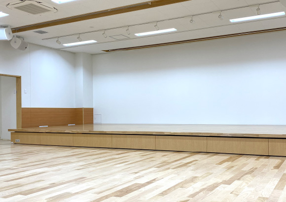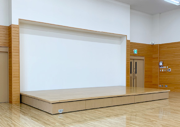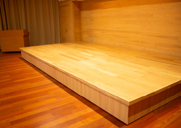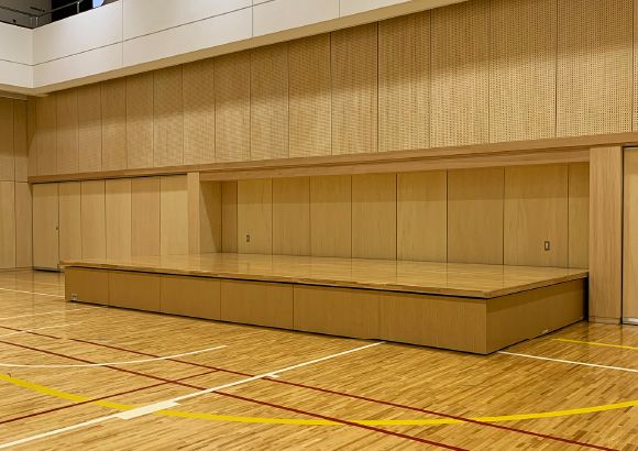 手動式壁面収納折畳みステージはステージの収納部を高くして、利用時のデッドスペースをなくしたステージです。スペースを広々と利用できます。