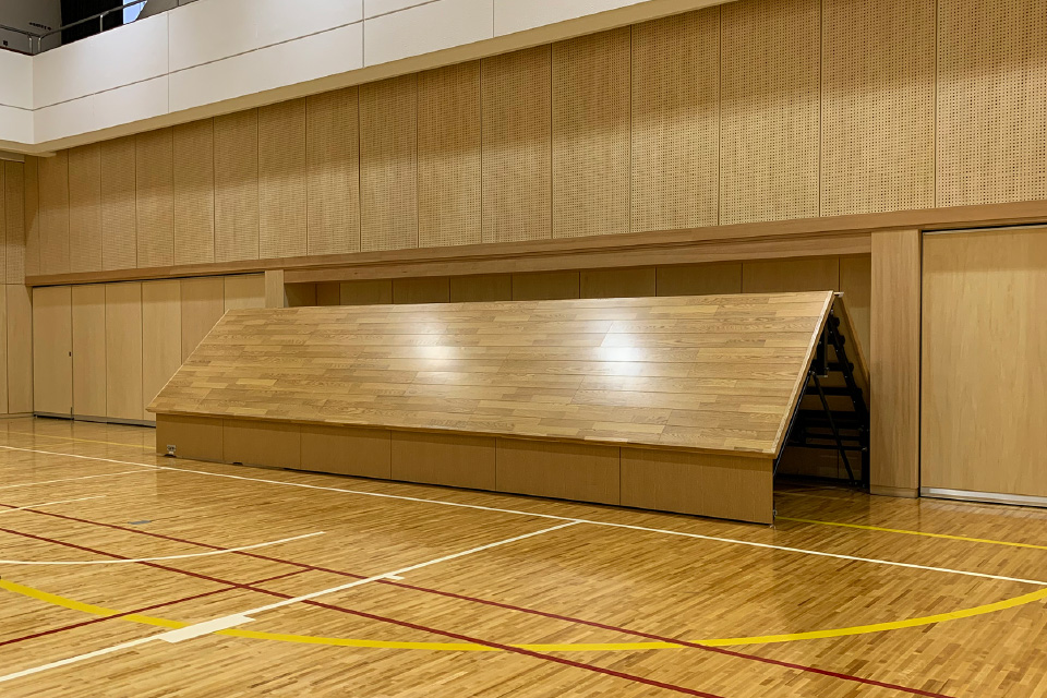 ND-10を展開した時に、ステージ側面の目隠しになります。幕板の仕上材は、設置場所の内装意匠に合わせることができます。
